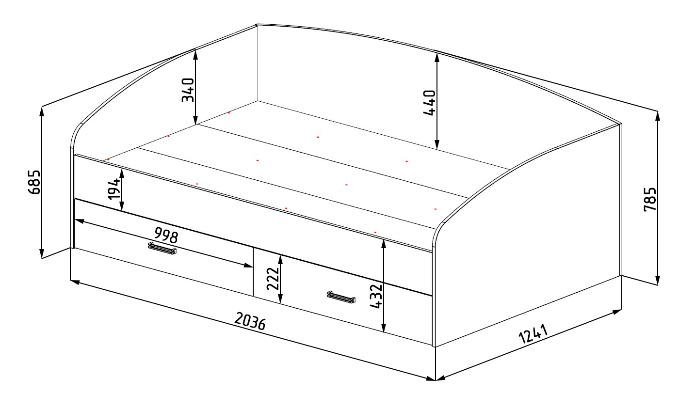 Габариты кровати: ширина 2036 х высота 785 х глубина 1241 мм