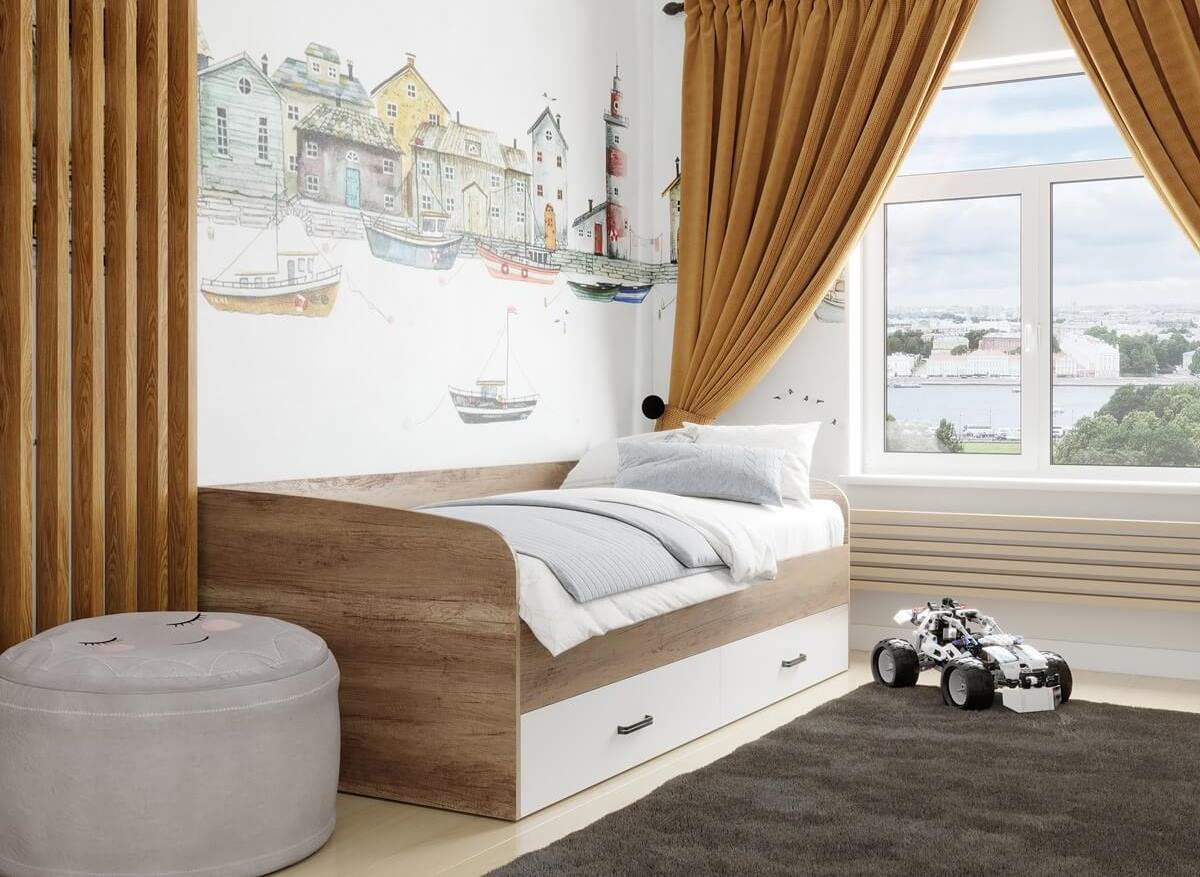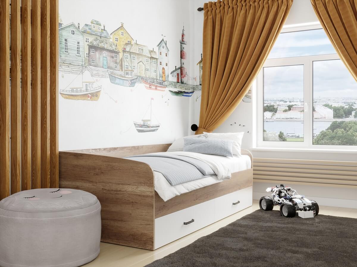 Кровать выполнена в современном дизайне, превосходно дополнит интерьер детской комнаты.