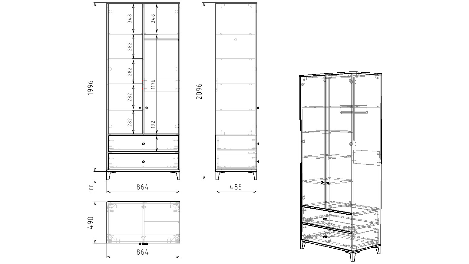 Габариты шкафа: ширина 864, глубина 490, высота 2096 мм
