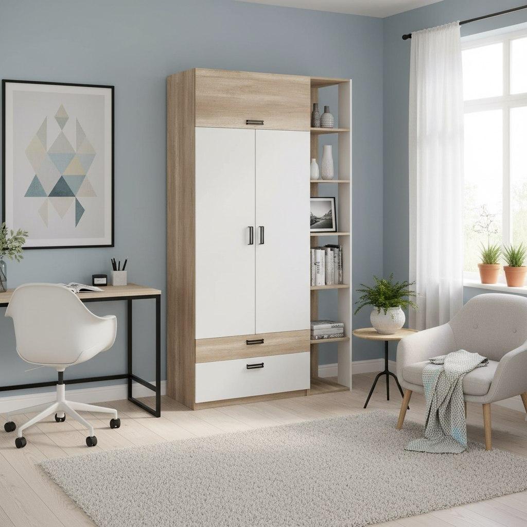 Идеально вписывается в детскую комнату, шкаф очень практичный и вместительный, по своим габаритам отлично подходит и для небольших комнат.