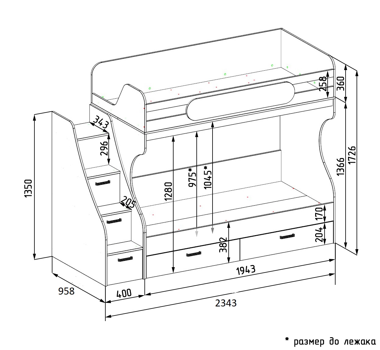 Габариты кровати с учетом лестницы: ширина 2343, глубина 958, высота 1726 мм