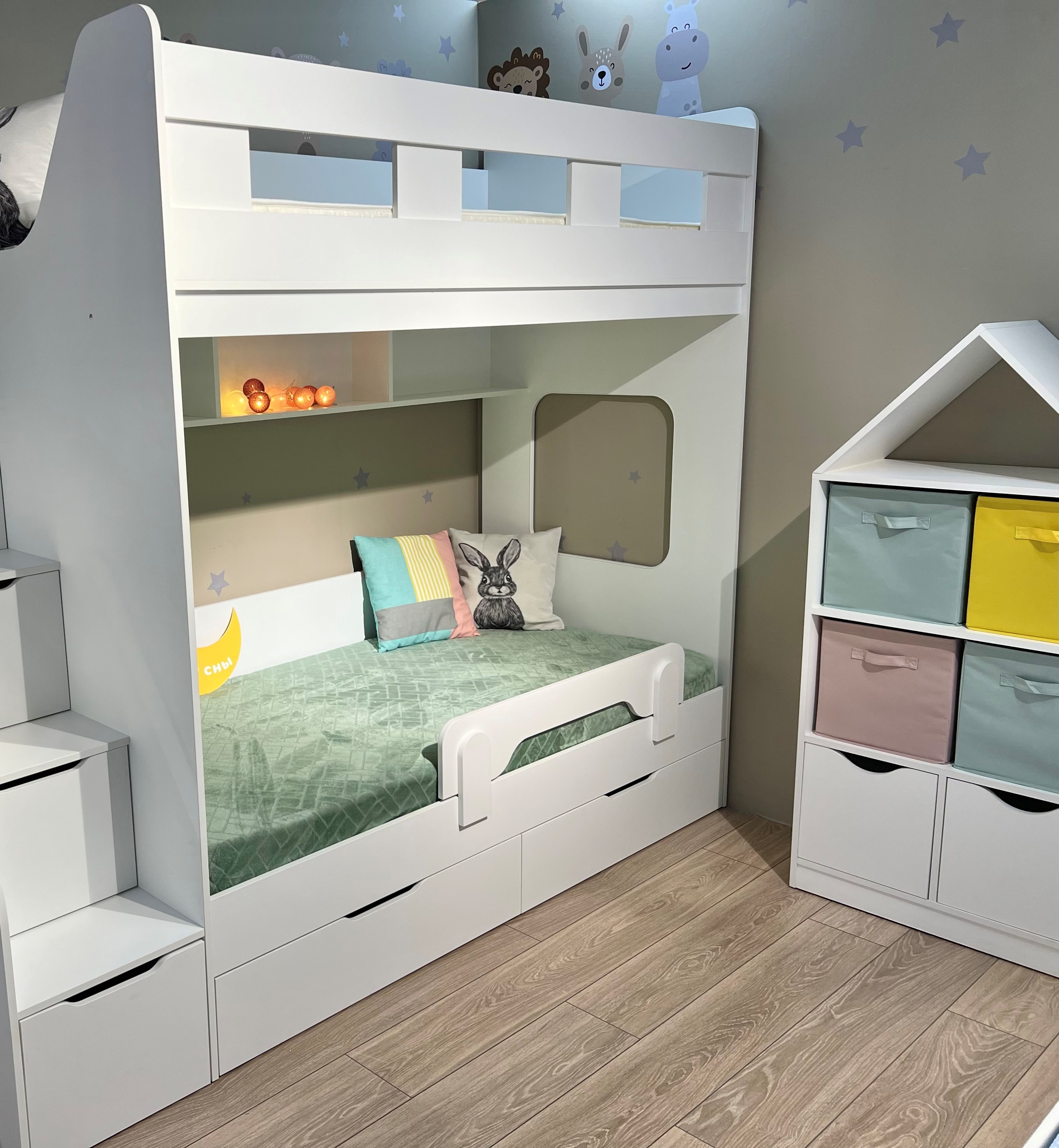 Высокая нагрузка на спальные места.. Удобная лестница-комод. Высокие, безопасные бортики. Прочные ящики! |