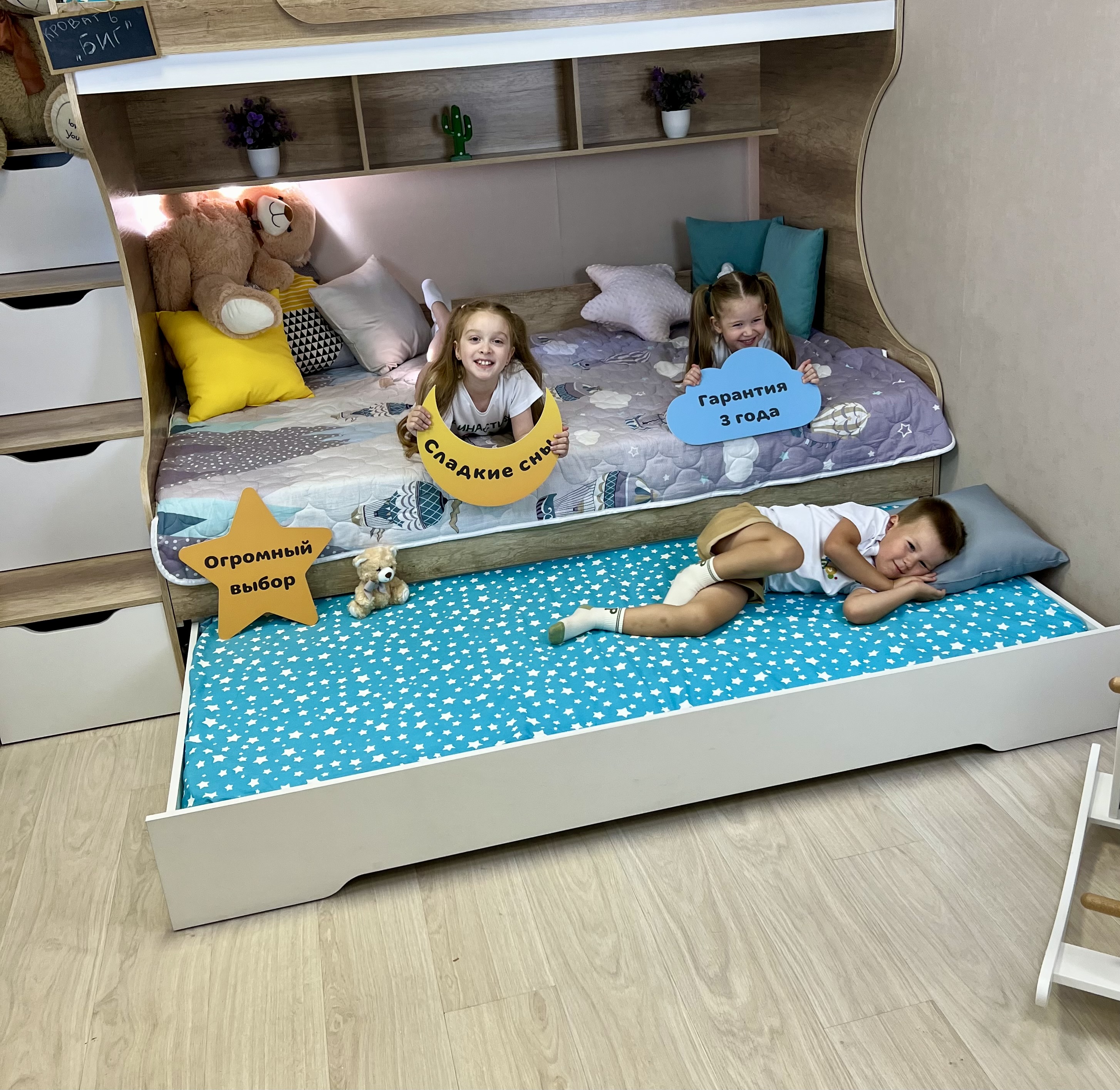 Увеличенное, просторное нижнее спальное место позволяет комфортно разместиться ребенку вместе со взрослым.
