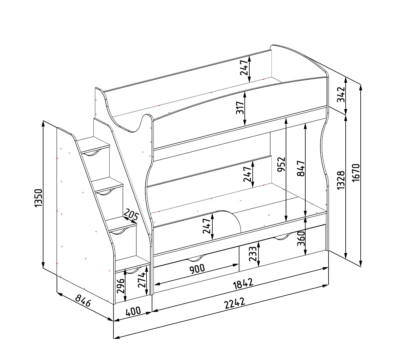 Габариты кровати: ширина с учетом лестницы 2242, глубина 846, высота 1670 мм