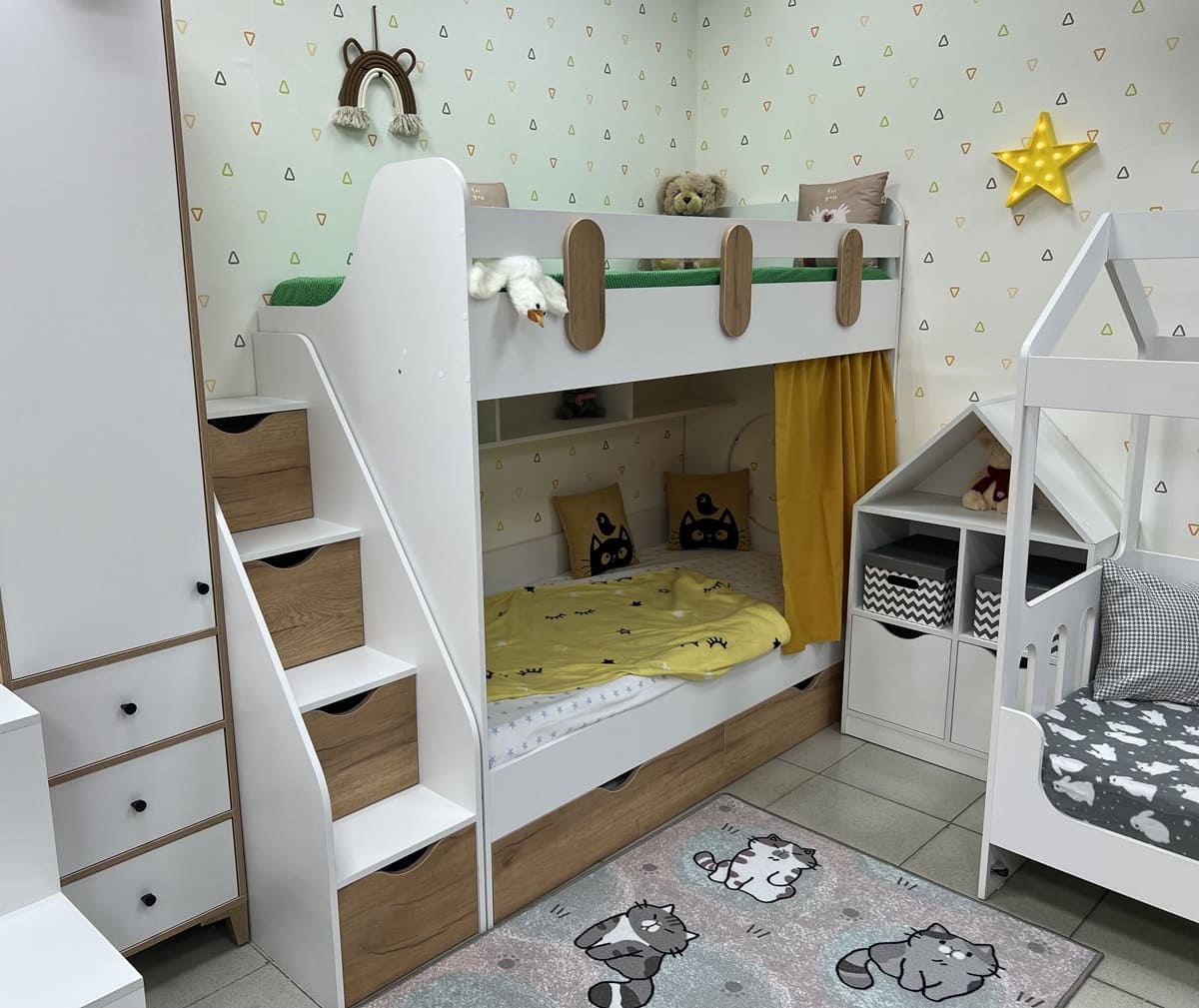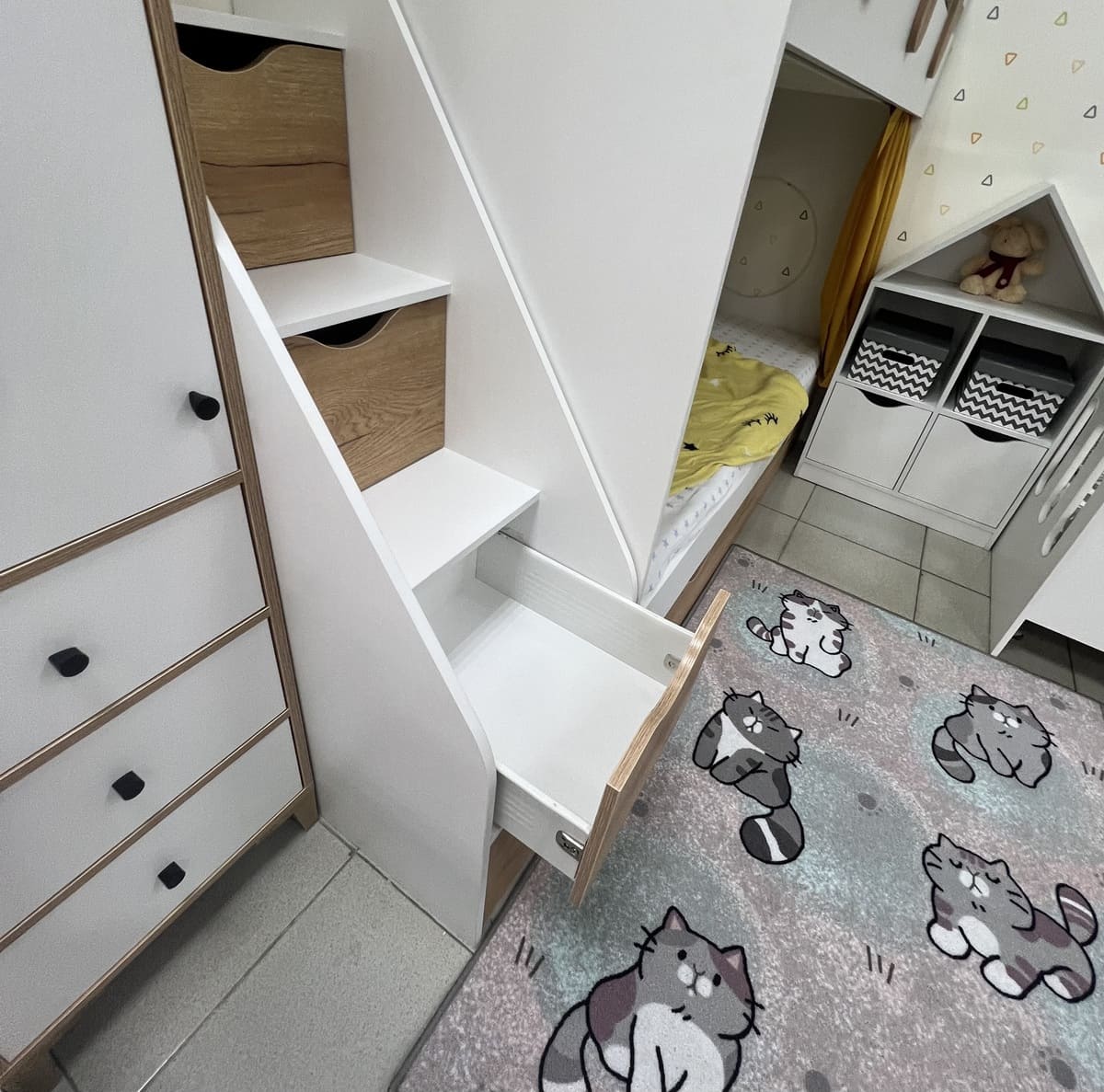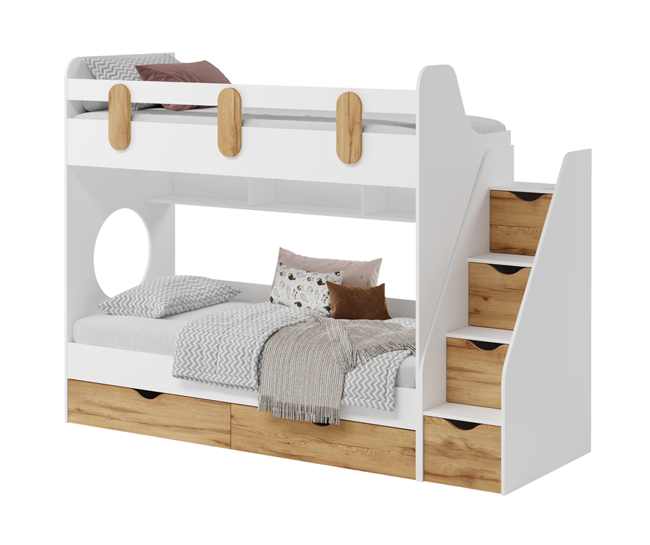 Выдвижные ящики в нижней кровати изготовлены с применением метабоксов, что делает изделие практичным и надежным.