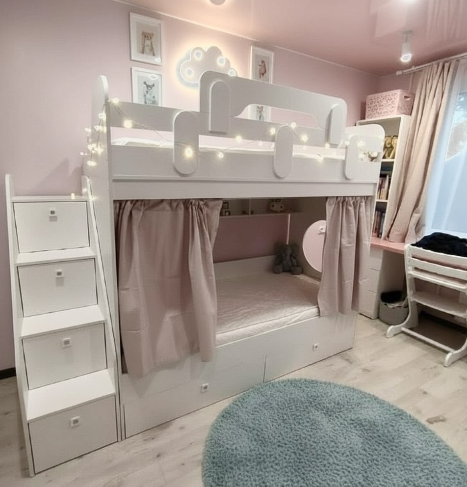 Два выдвижных ящика нижней кровати с прочным дном из ЛДСП 16 мм (не ДВП, не ХДФ!) выдерживают нагрузку до 45 кг каждый.