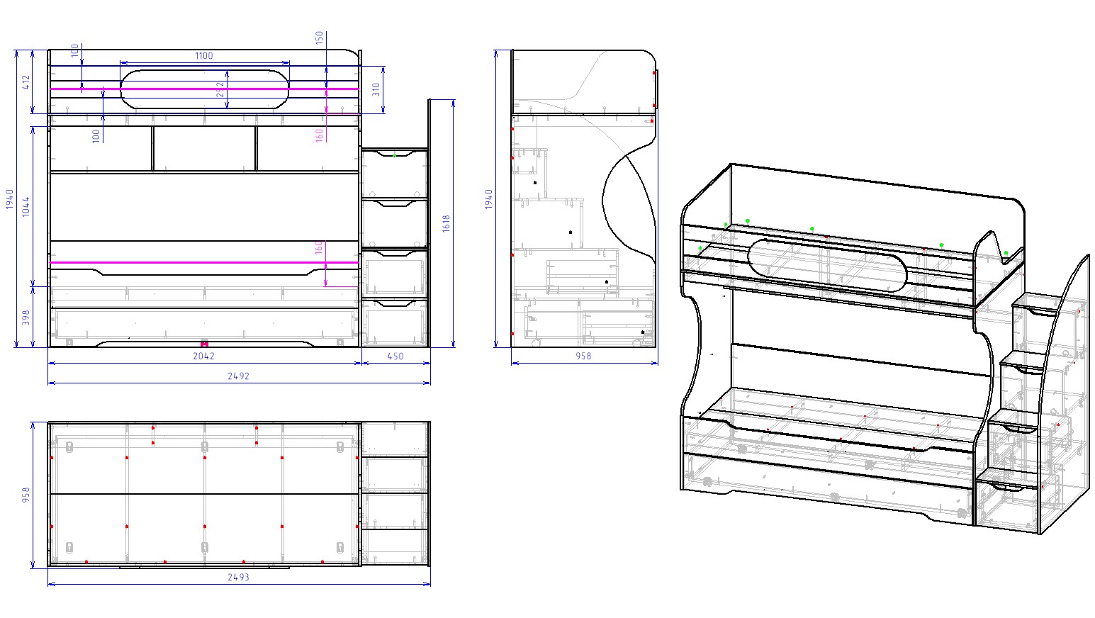 Габариты кровати с учетом лестницы: ширина 2493, глубина 958, высота 1940 мм