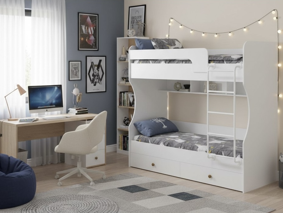 Двухъярусная кровать в белом цвете идеальна для любых интерьеров.