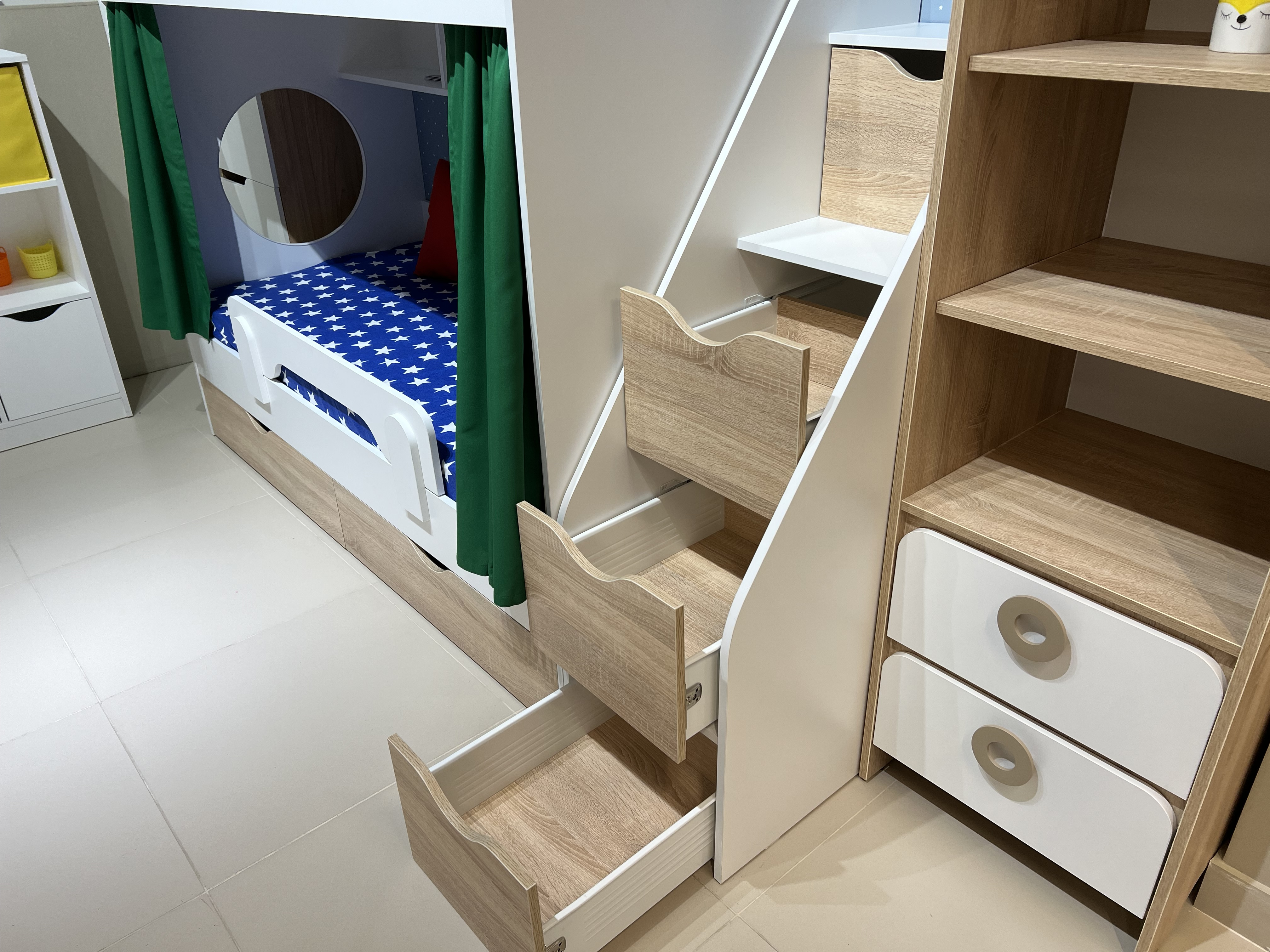 Выдвижные ящики в нижней кровати изготовлены с применением метабоксов, что делает изделие практичным и надежным.