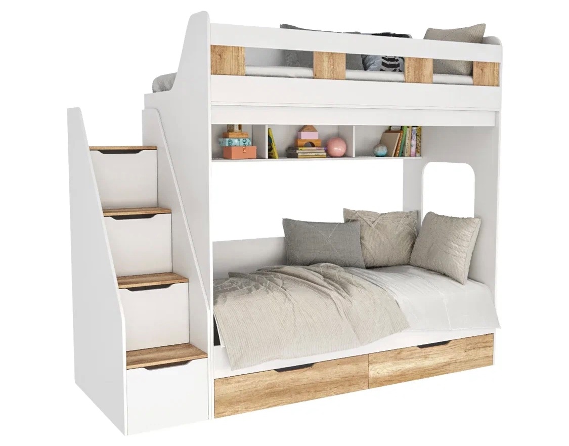 спальное место для двоих, навесная полка для книг и игрушек, вместительные выдвижные ящики под кроватью, а также безопасная лестница расположенная сбоку, обеспечивающая быстрый и удобный доступ на второй этаж, с безопасными ступенями в виде выдвижных ящиков.