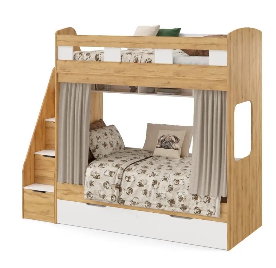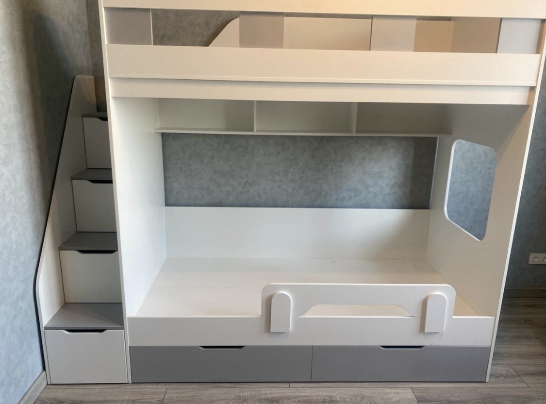 спальное место для двоих, навесная полка для книг и игрушек, вместительные выдвижные ящики под кроватью, а также безопасная лестница расположенная сбоку, обеспечивающая быстрый и удобный доступ на второй этаж, с безопасными ступенями в виде выдвижных ящиков.