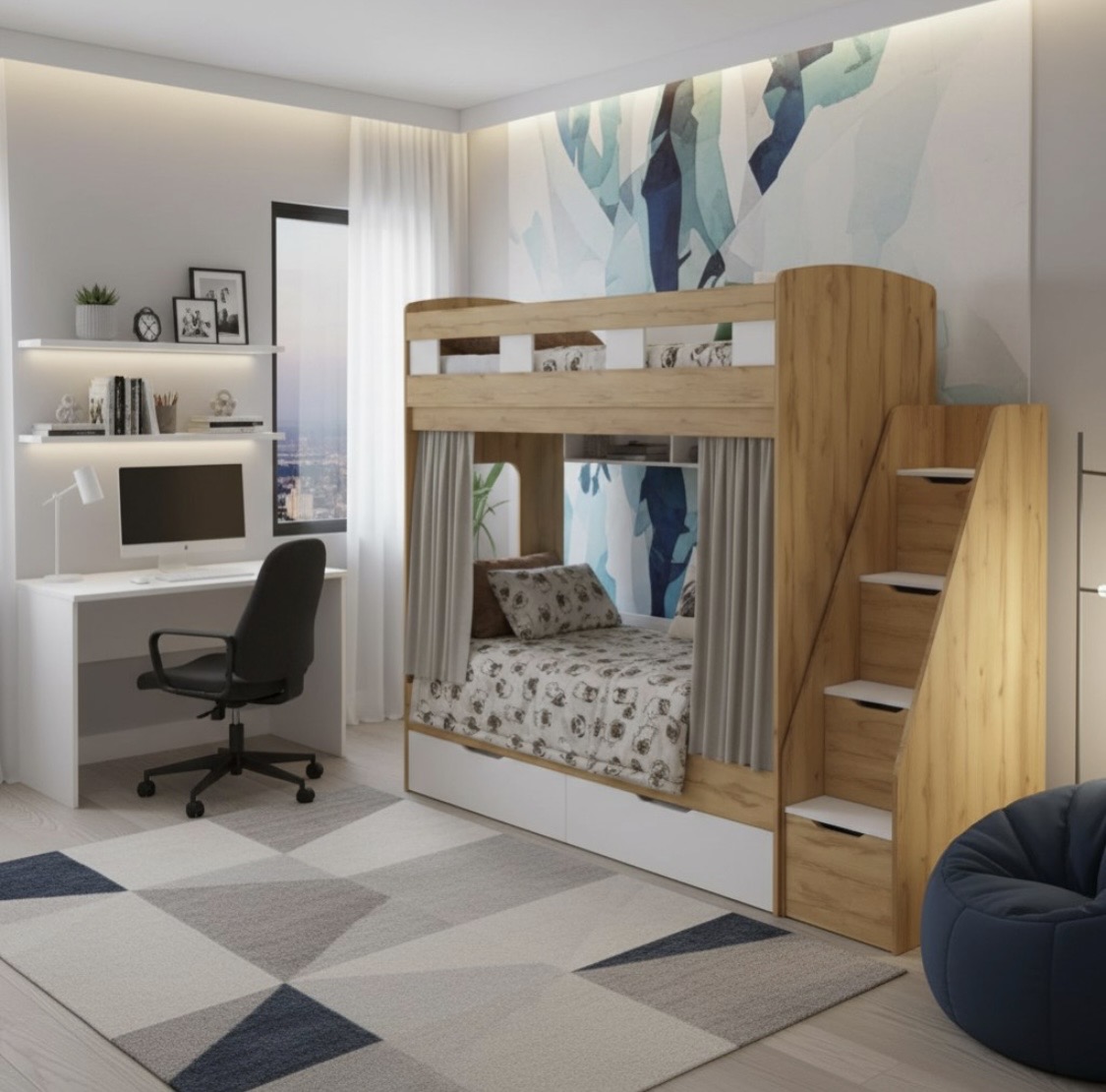спальное место для двоих, навесная полка для книг и игрушек, вместительные выдвижные ящики под кроватью, а также безопасная лестница расположенная сбоку, обеспечивающая быстрый и удобный доступ на второй этаж, с безопасными ступенями в виде выдвижных ящиков.