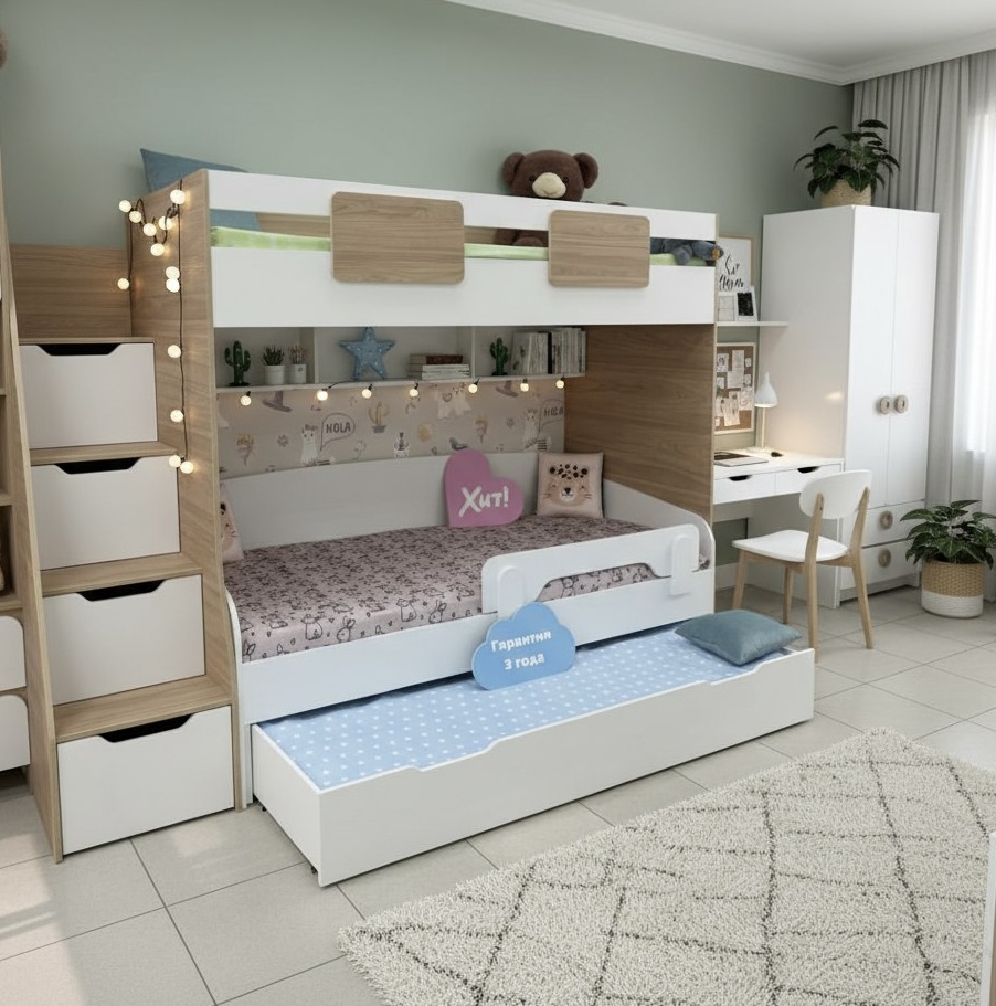 Вместо них - цельный и прочный настил из ЛДСП, который выдерживает сверхвысокую нагрузку и позволяет расположиться даже взрослому с ребенком.