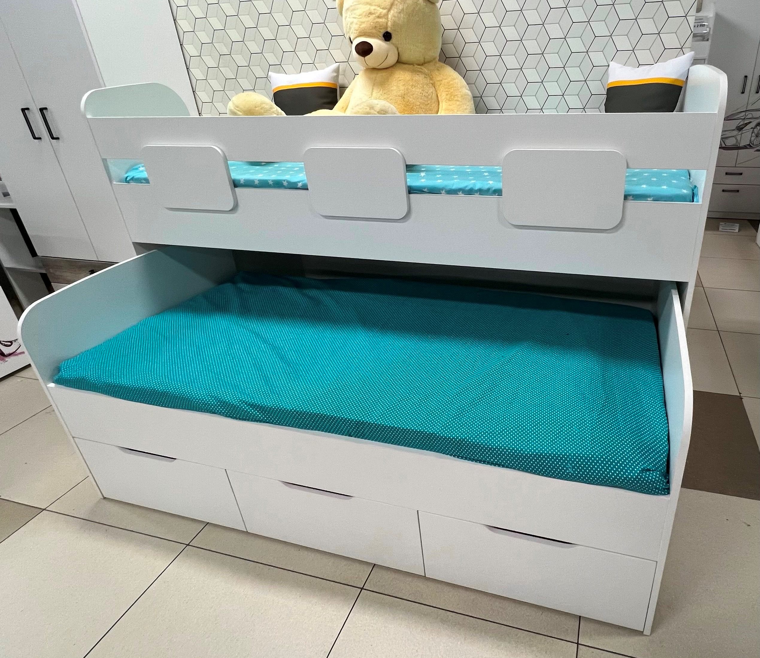 Нижняя кровать выдвигается полностью благодаря колесным опорам.