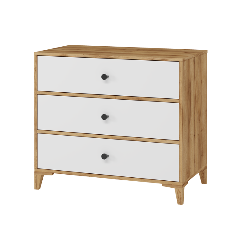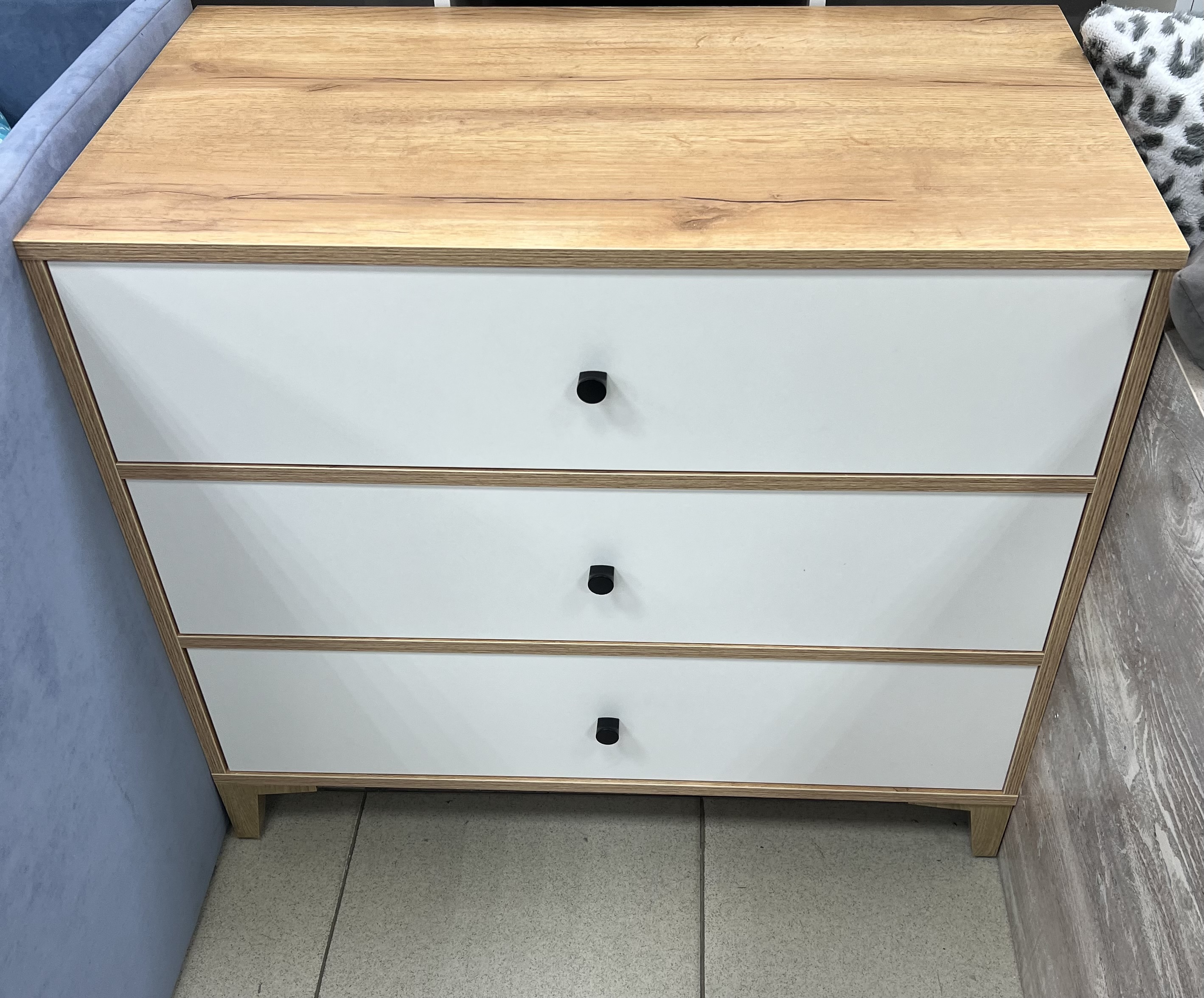 В комод встроены три выдвижных ящика на направляющих скрытого монтажа с ДОВОДЧИКАМИ.