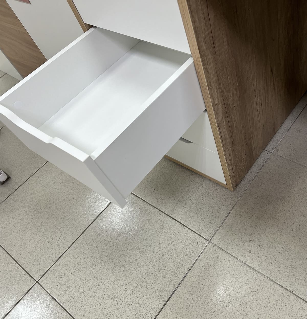 Выдвижные ящики тумб на направляющих скрытого монтажа с доводчиками.
