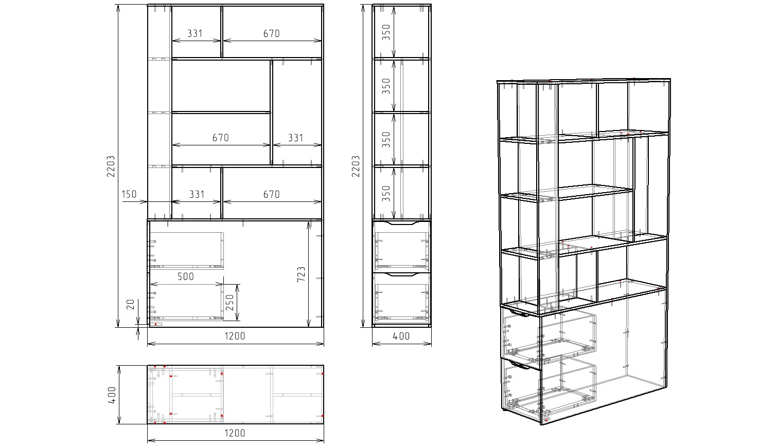 Габариты стеллажа: высота 2203, глубина 400, ширина 1200 мм