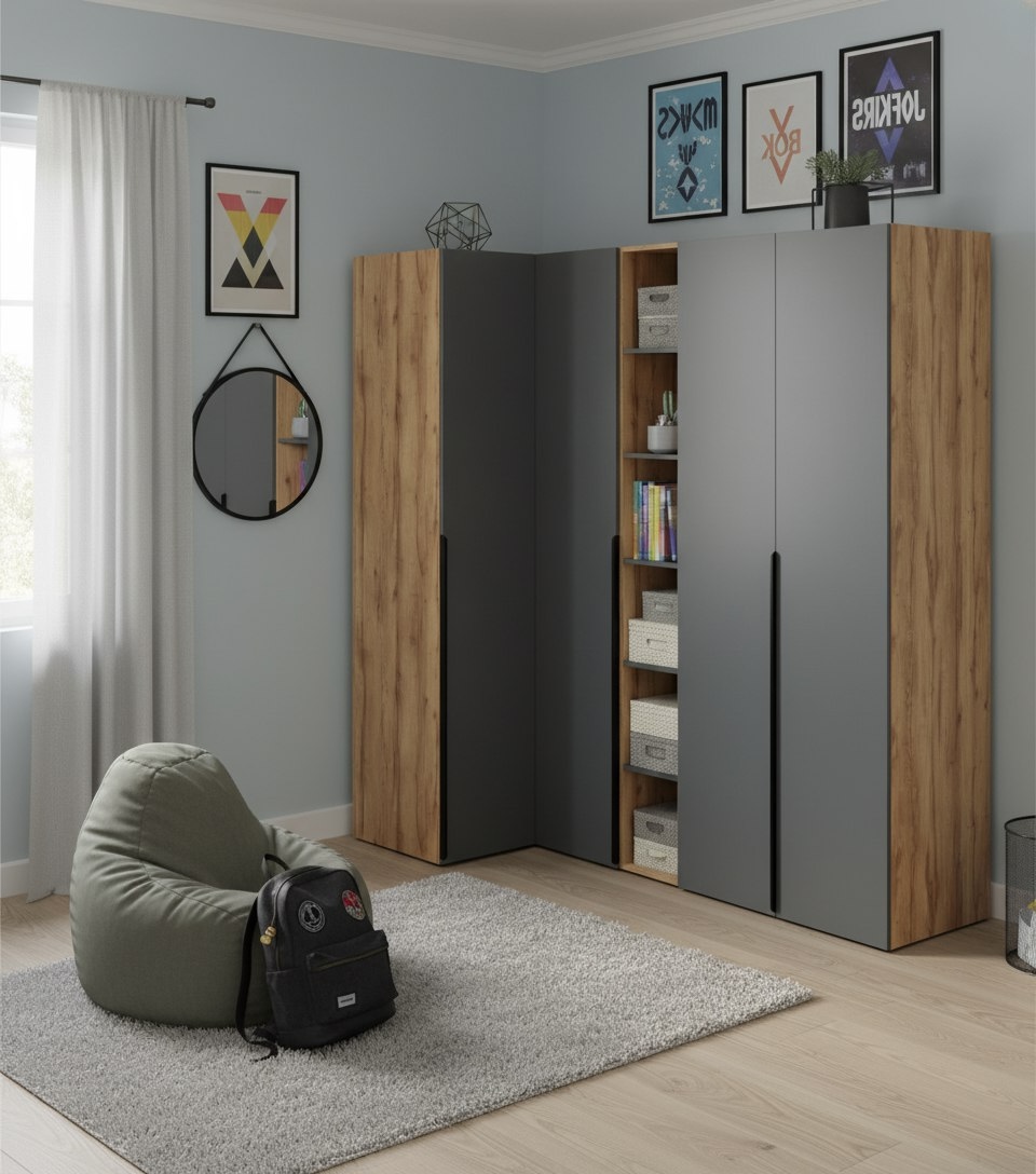 Распашной двухстворчатый шкаф + переходной стеллаж + угловой шкаф + пенал коллекции Брайт Графит