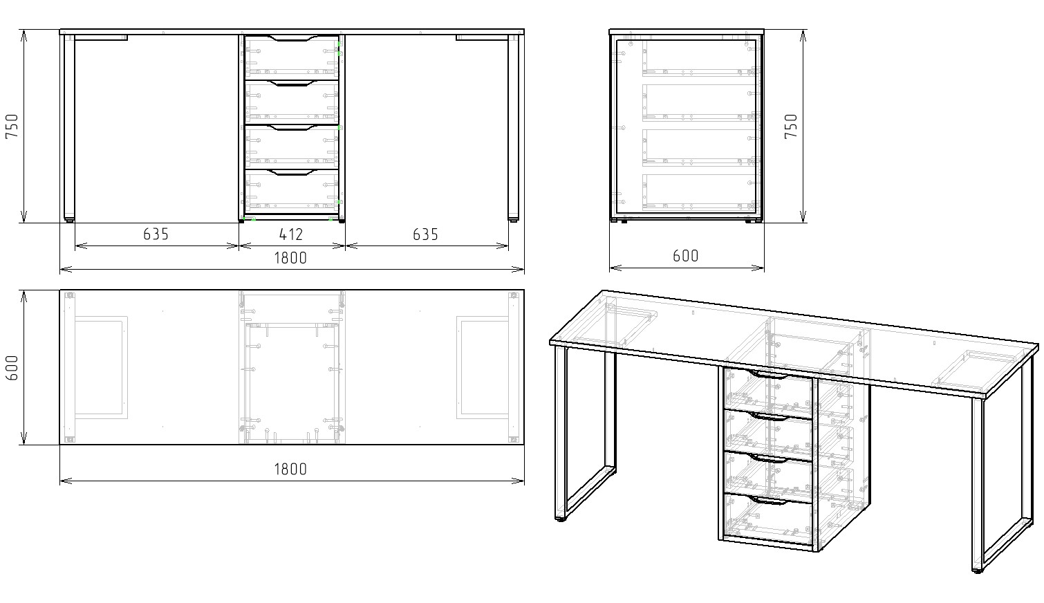 Габариты стола: ширина 1800 х высота 750 х глубина 600 мм