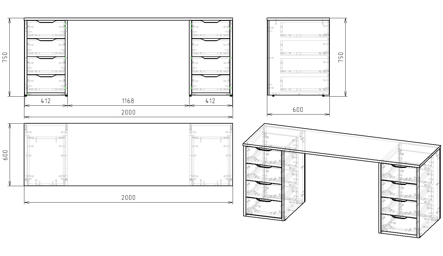 Габариты стола: ширина 2000 х высота 750 х глубина 600 мм