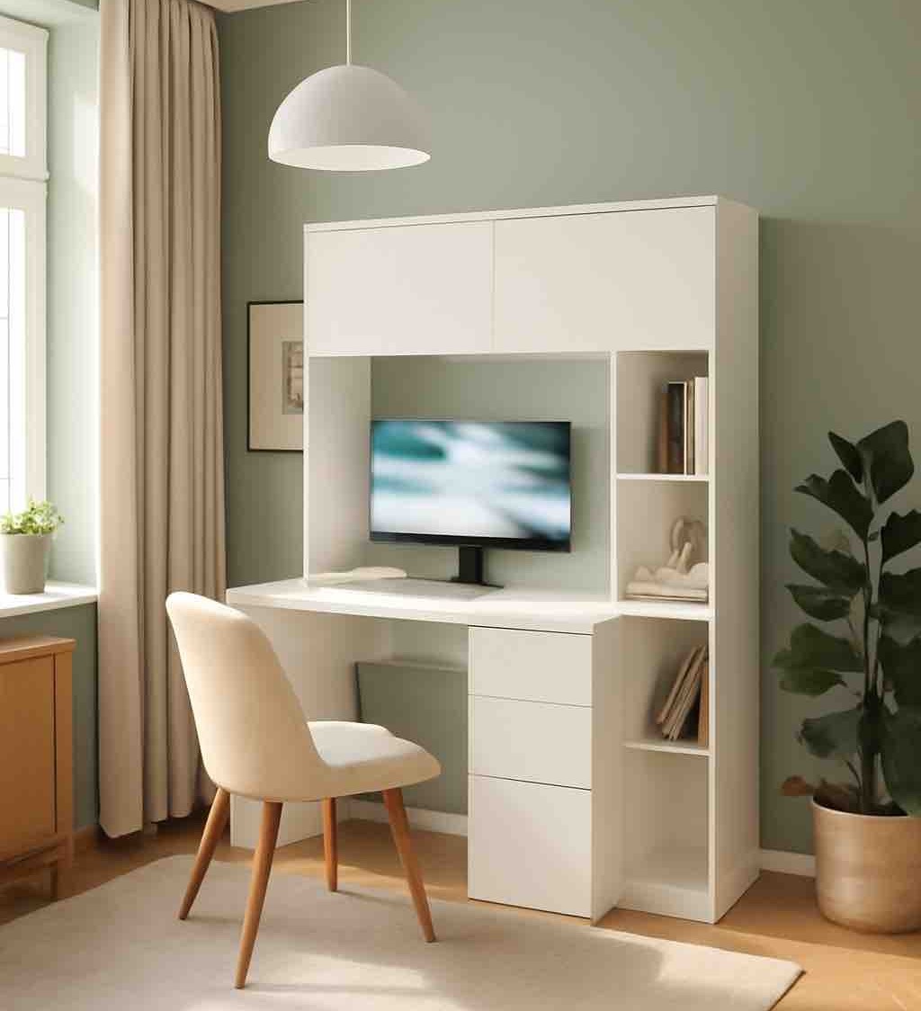 Просторная поверхность, удобные полки и ящики позволят разместить учебники, книги и канцелярию.
