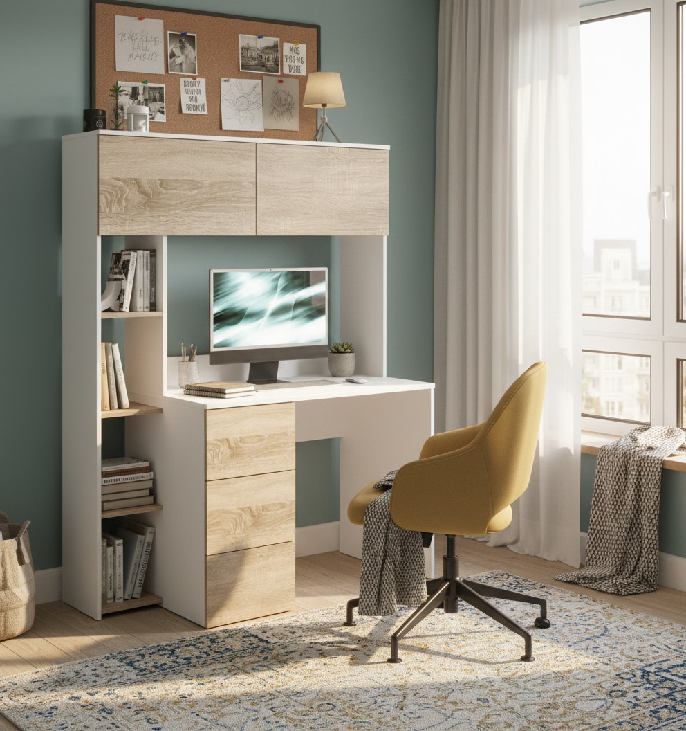 Просторная поверхность, удобные полки и ящики позволят разместить учебники, книги и канцелярию.