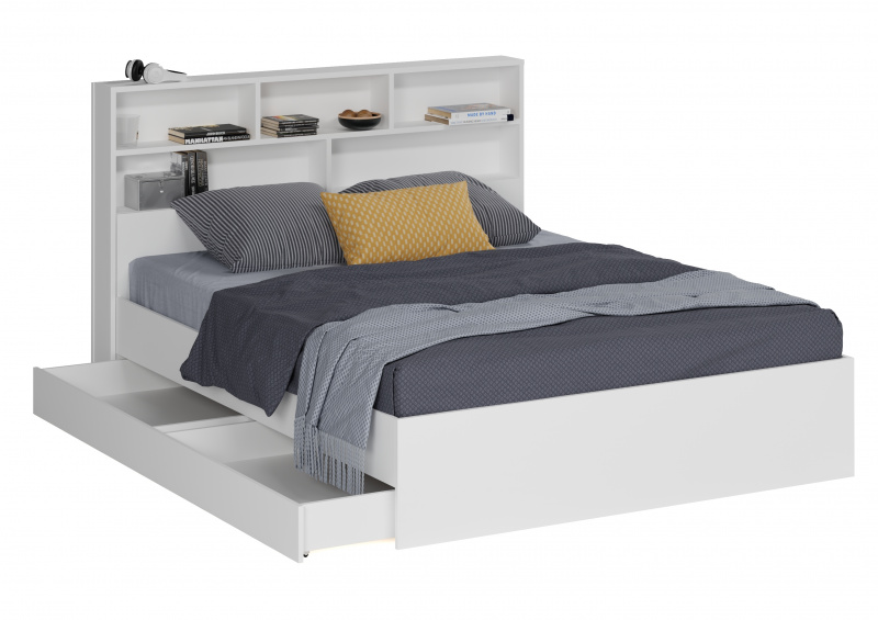 В кровать встроен выдвижной полновыкатной ящик на выкатных роликах.