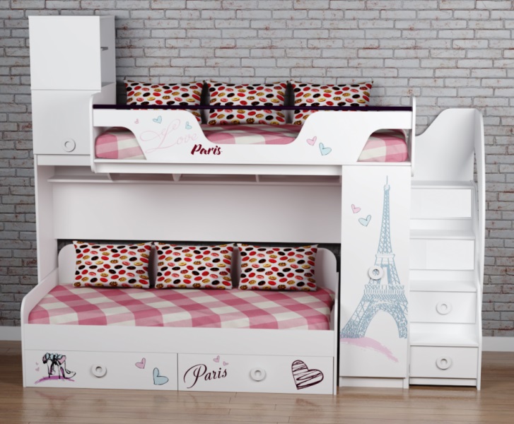 В кровать встроен шкаф для размещения одежды (внутри шкафа имеются штанга для белья и полки) и удобная лестница с ящиками для игрушек.