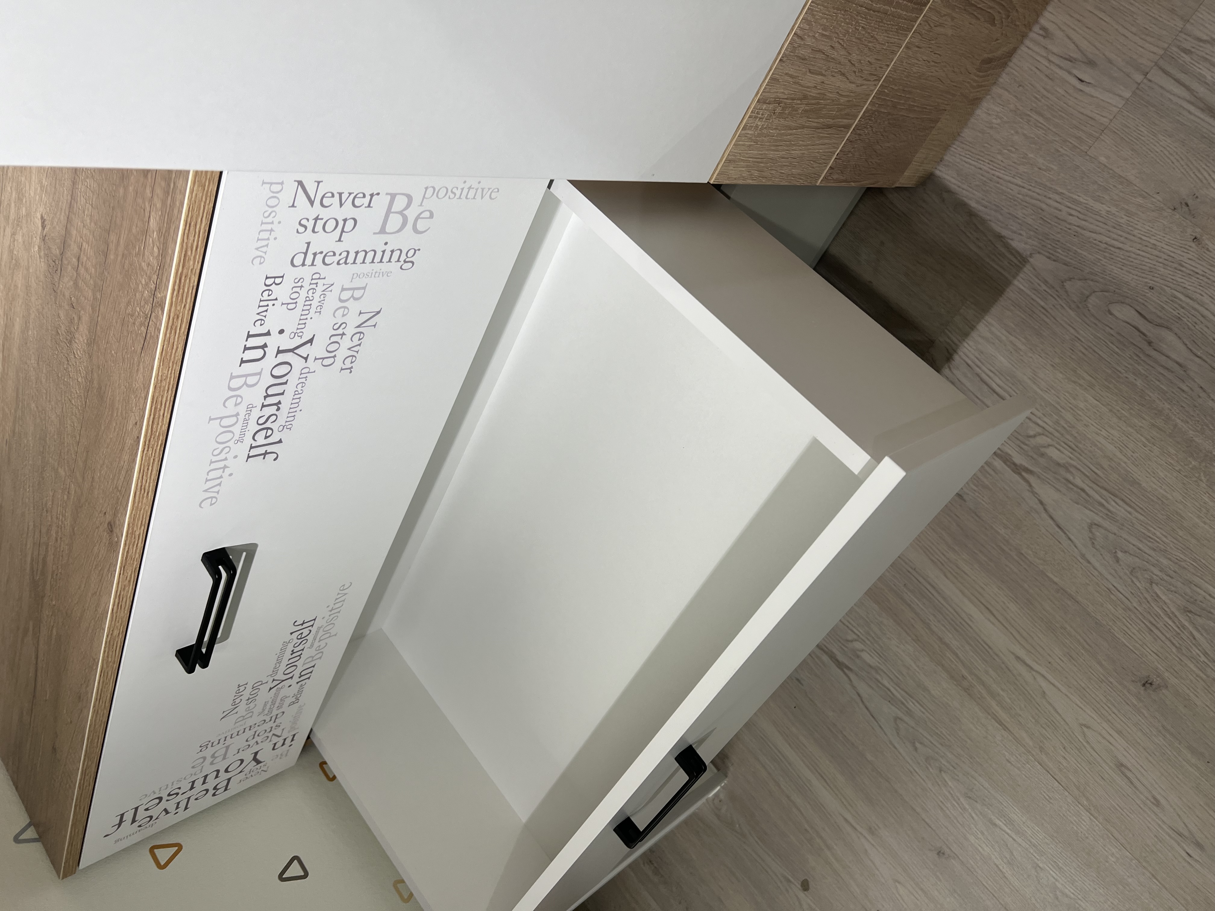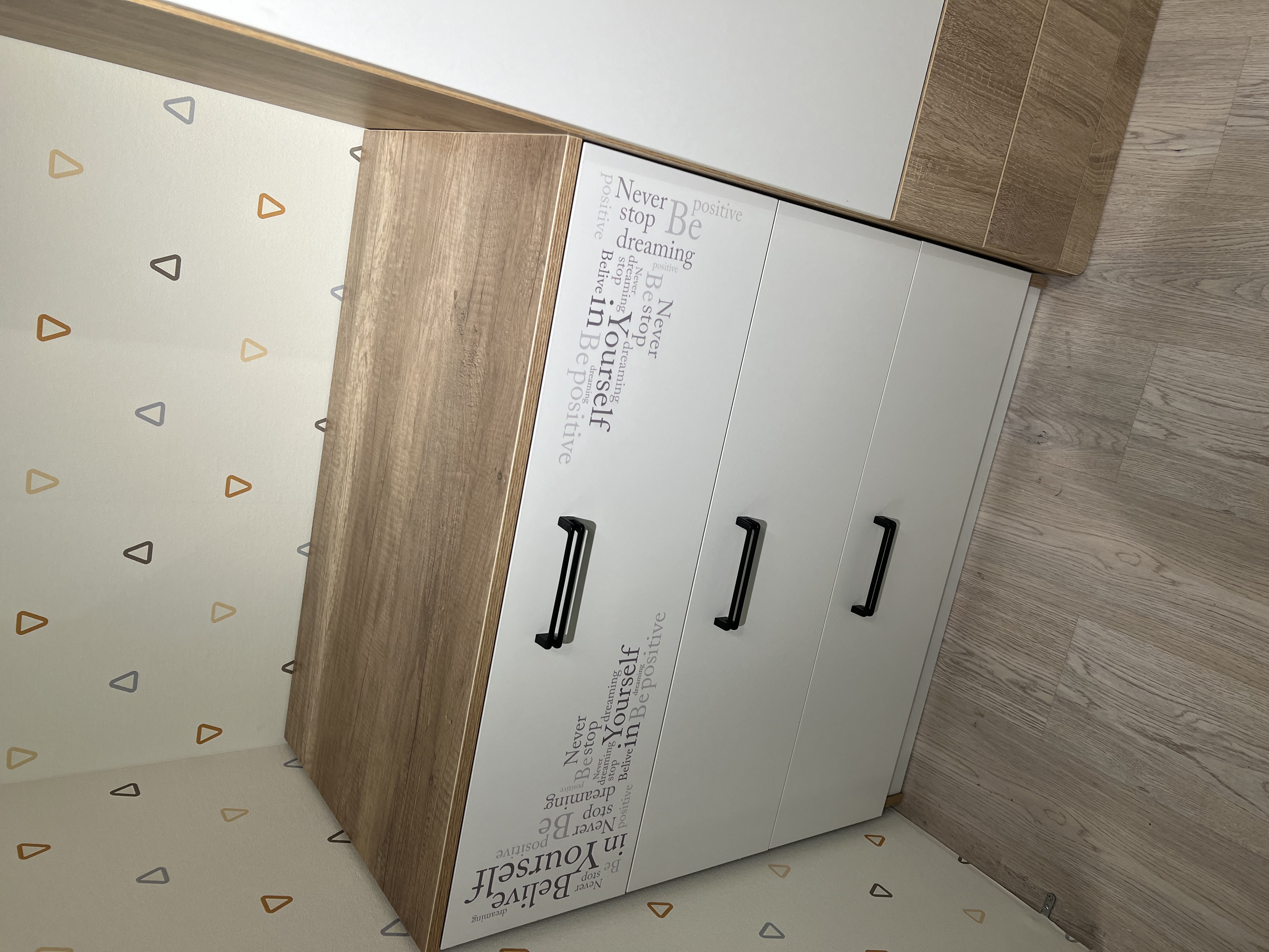 Мебель "Твой Стиль" выполнена из качественного, экологически чистого ЛДСП класса Е0,5 в сочетании цветов "дуб каньон + белый" и оформлена дизайнерским принтом.