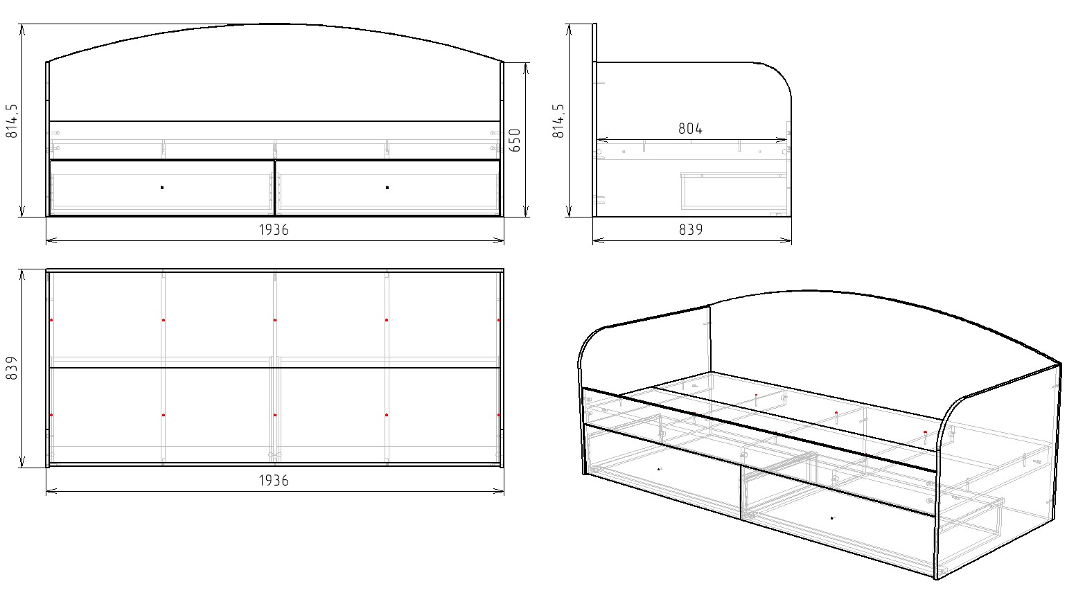 Габариты кровати: ширина 1936 х высота 815 х глубина 839 мм