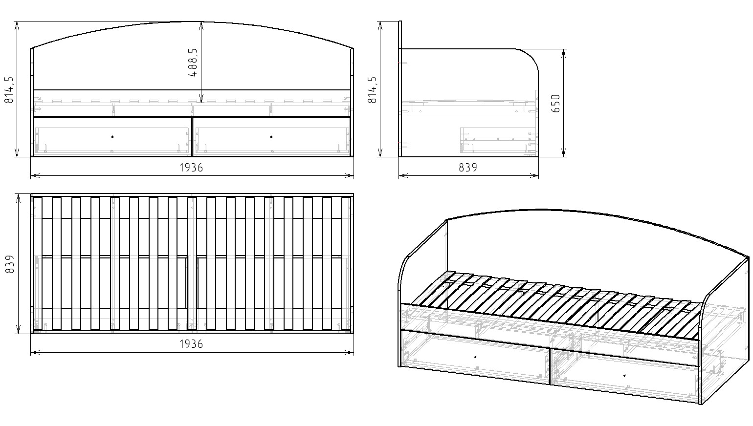 Габариты кровати: ширина 1936 х высота 814,5 х глубина 839 мм