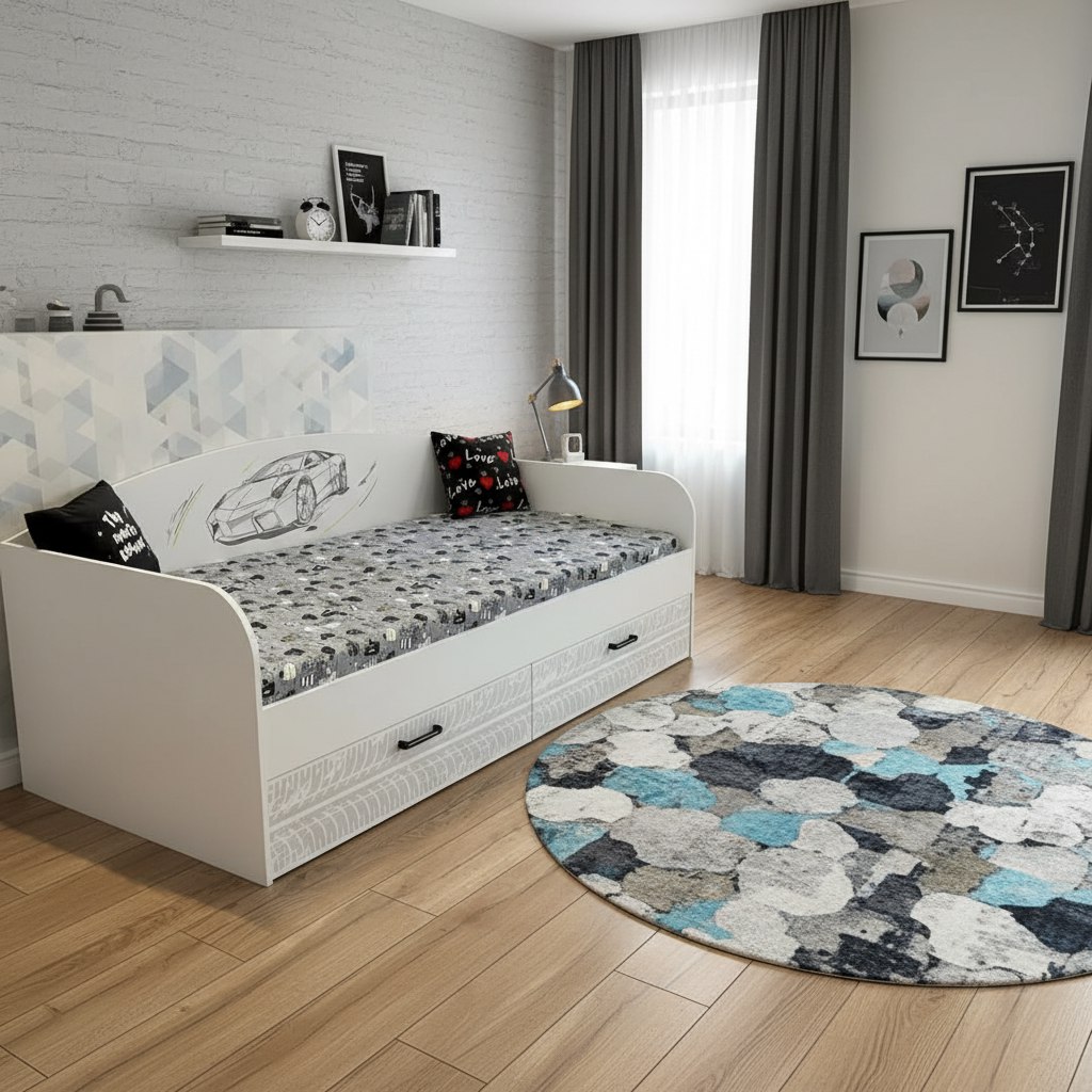 Кровать в современном и стильном дизайне превосходно дополнит интерьер детской комнаты.