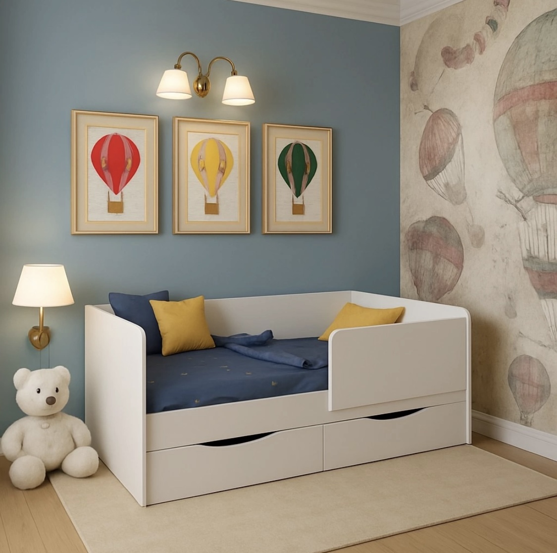 Защитный бортик предохранит ребенка от падения.