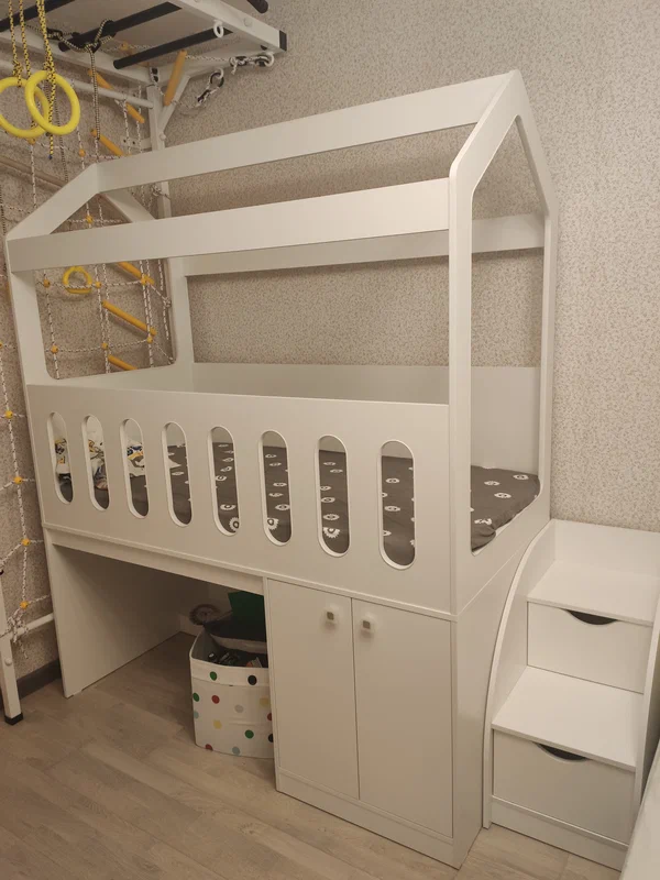 <virtues>Обалденный домик! Доча в восторге. Очень удобный и функциональный. Шкафчик очень вместительный, в лесенке тоже есть ящички. Спасибо вам огромное за такую красоту! </virtues>