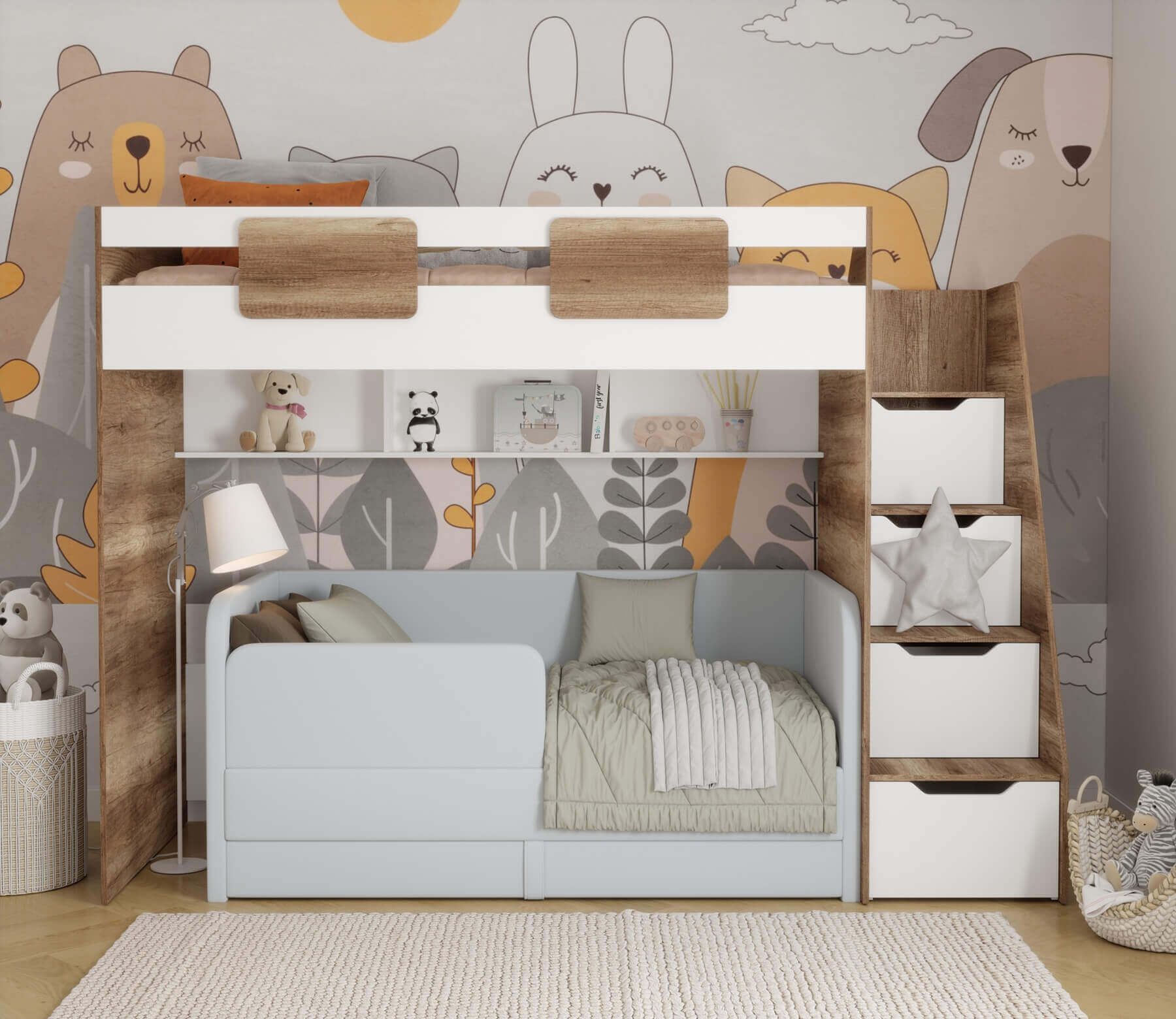 Основание кровати – прочный настил ЛДСП, который позволяет ребенку спать на ровной поверхности, что важно для детской спины.