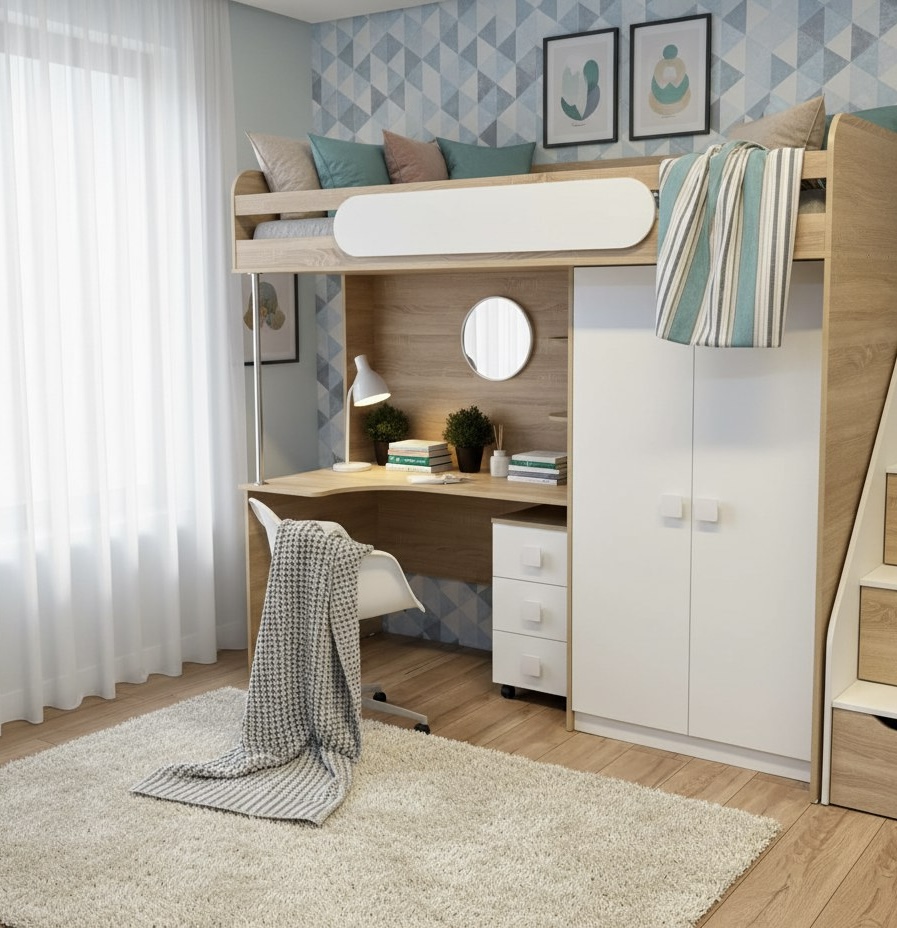 <comment>Классная кровать-чердак) все продуманно, снизу письменный столик с ящиками. Ступеньки тоже функциональные. Высокие бортики не дадут упасть нашему непоседе. Ребенок просто в восторге! Спасибо вам!</comment>