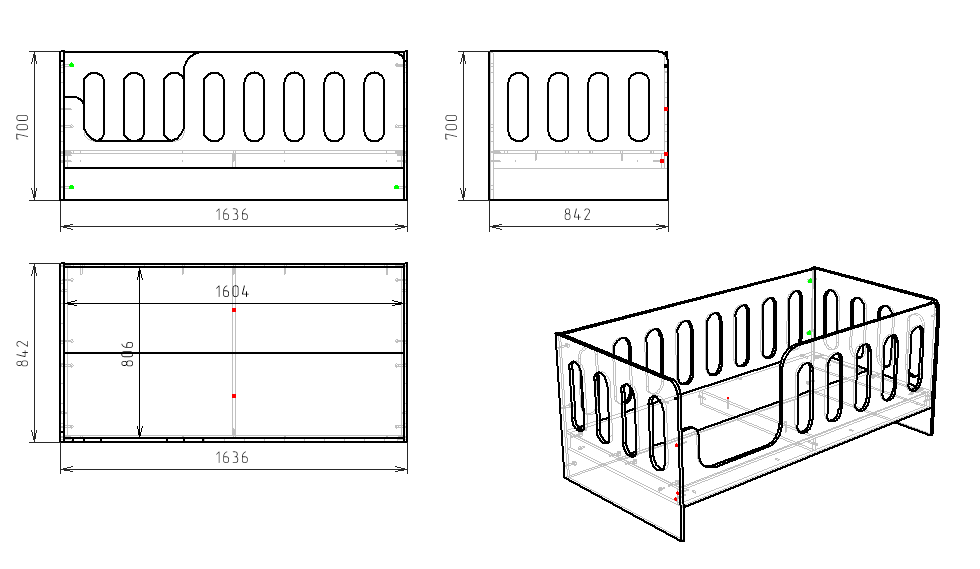 Габариты кровати: ширина 1640, глубина 840, высота 700 мм