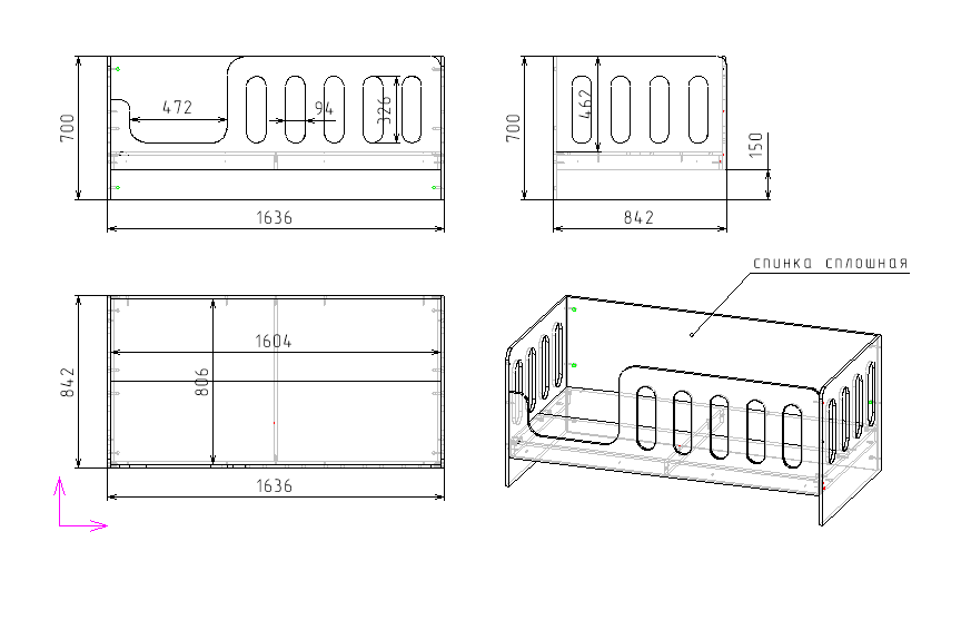 Габариты кровати: ширина 1640, глубина 840, высота 700 мм