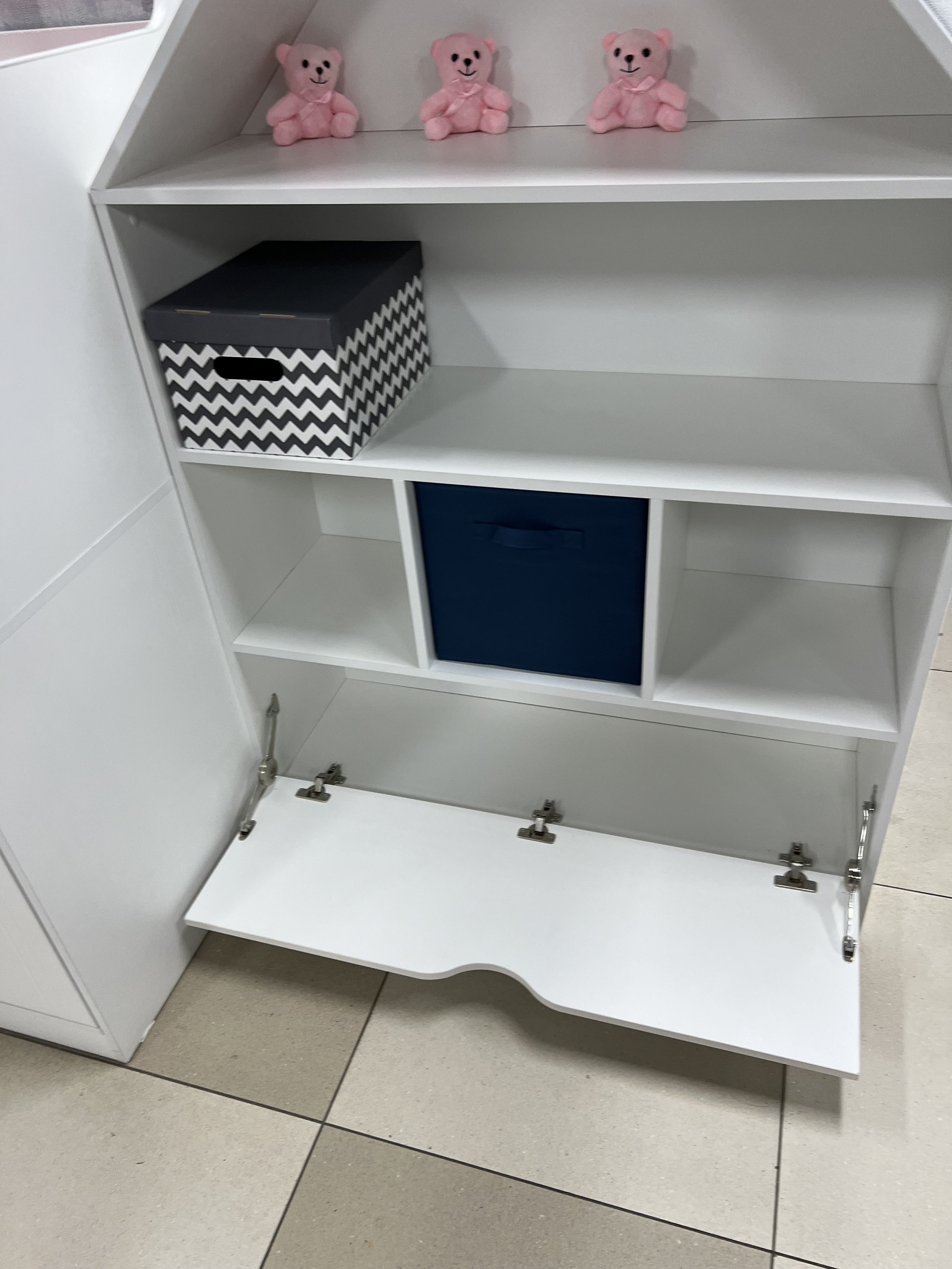 * Дверка стеллажа открывается вниз.
