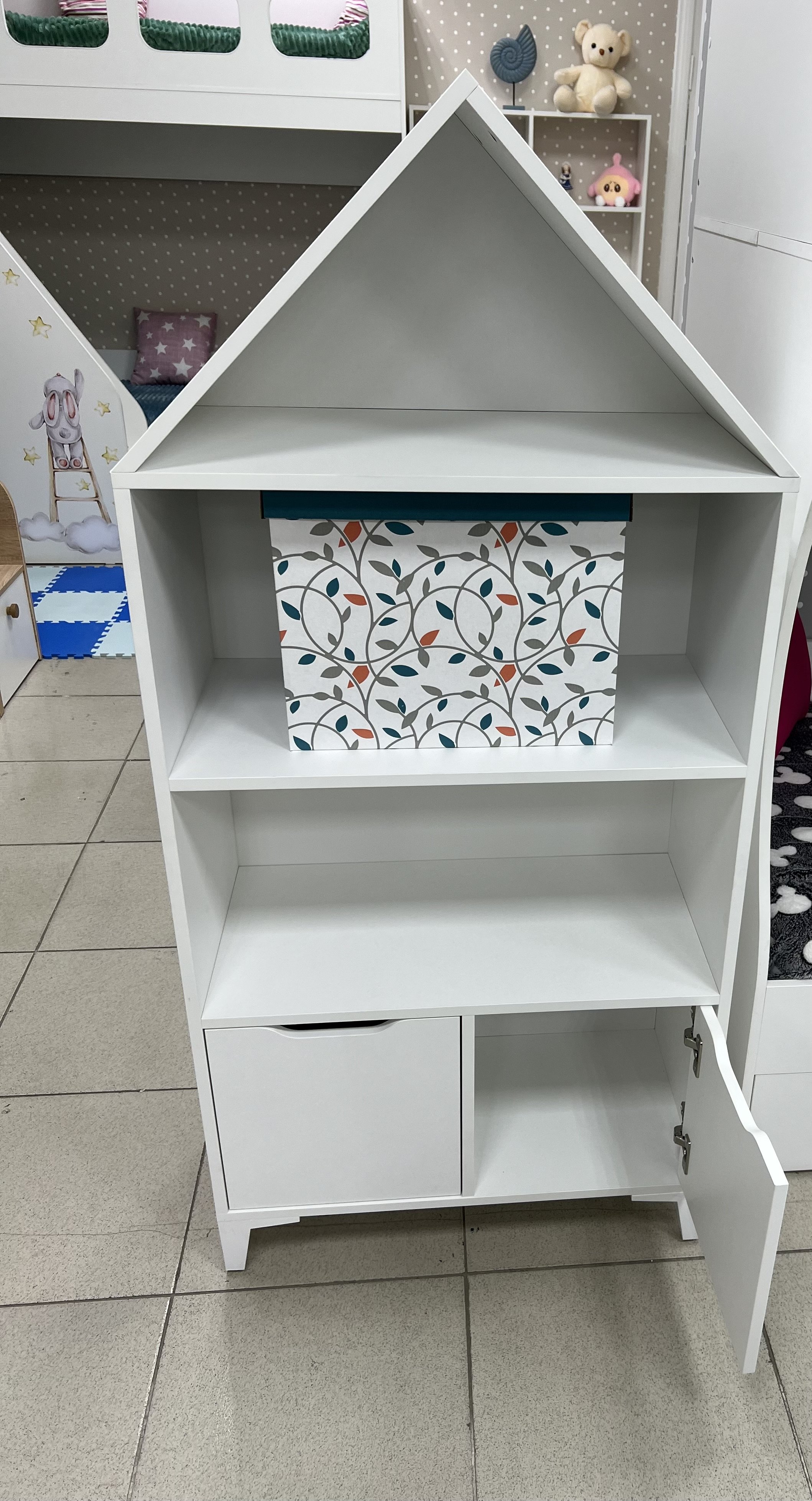 Стеллаж в виде домика - оригинальное и практичное дополнение в интерьере детской комнаты.