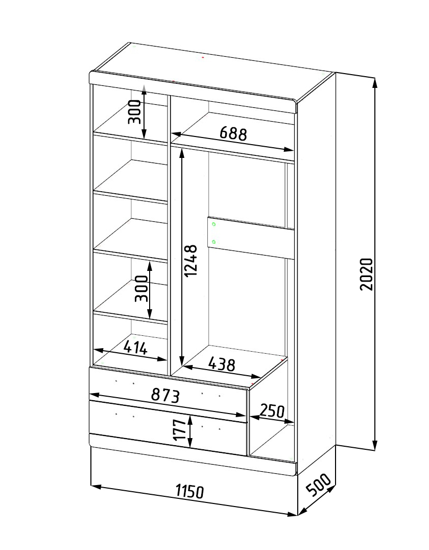 Габариты шкафа: ширина 1150 x глубина 500 x высота 2020 мм