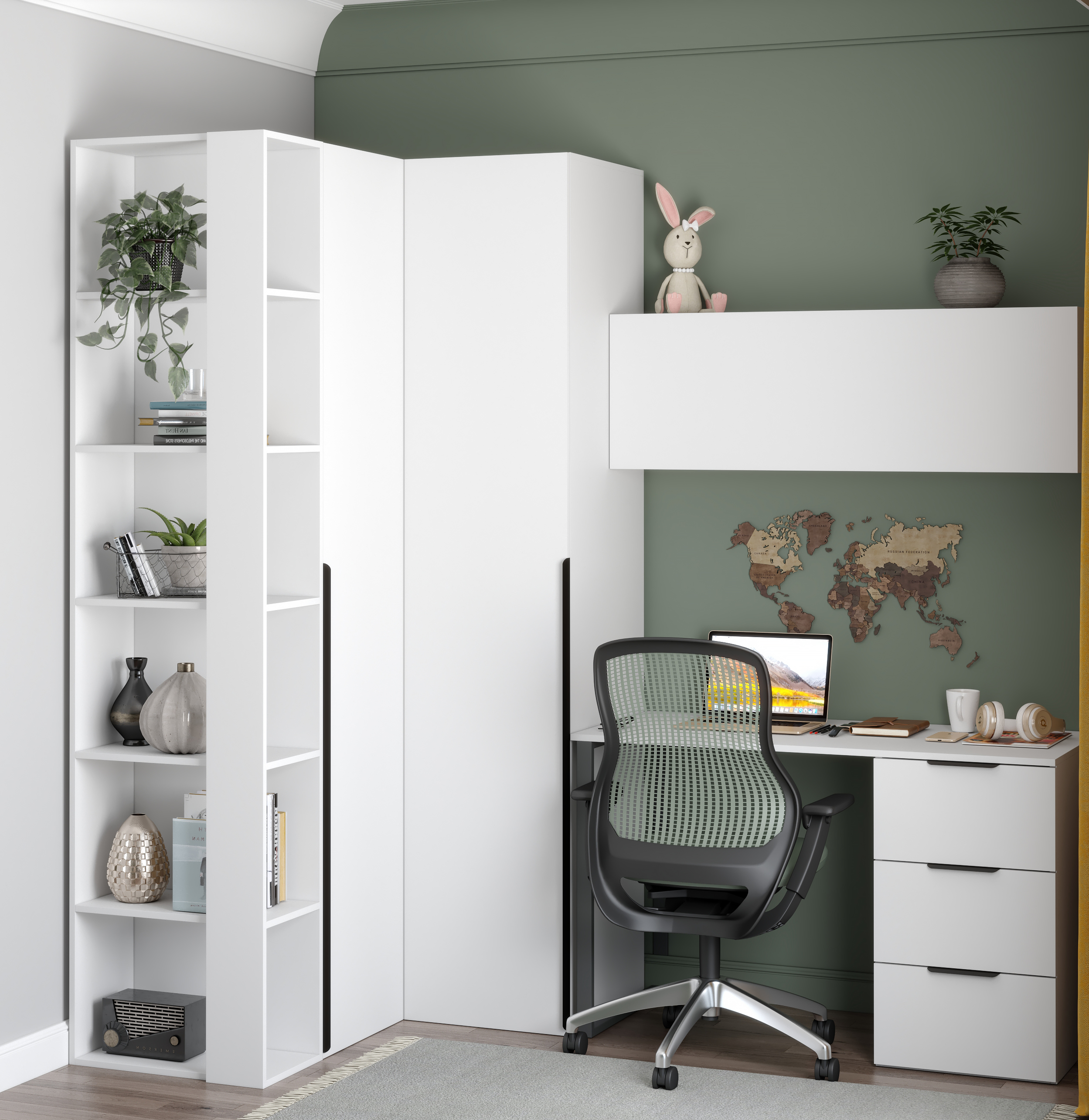 угловой шкаф + пенал + торцевой стеллаж + стол + полка